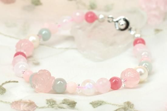 素材:ローズクオーツ10mm薔薇,、8mm玉薔薇彫り、6mm玉多面カット ピンクオパール5mm玉多面カット 淡水パール7mm玉 ジェイド(翡翠)6mm玉 ロードクロサイト(インカローズ)5mm玉 ムーンストーン6mm玉 ボタンカット水晶