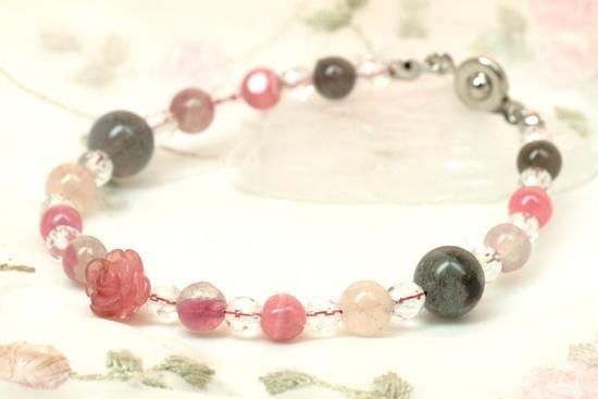 素材:ロードクロサイト(インカローズ)8mm薔薇、5.5mm玉 ピンクトルマリン6mm玉 ラブラドライト8mm玉 モルガナイト6mm玉 水晶4mm玉多面カット