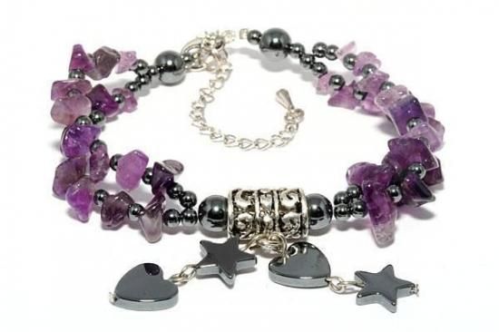 綺麗な紫のアメジストさざれとヘマタイトの星とハートチャームのついた、存在感あるブレスレット。アメジストは持つ人の格を上げ、好きな人の一番になれるよう後押しし、ヘマタイトが持久力と勝負運をサポートします。星は願いを叶え、ハートは恋愛運全般をアップ。ゆとり含め16.5〜21.5cmで調整可能。1点のみのご提供です。