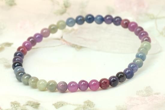 色のグラデーションが美しいミックスサファイア。各色が持つエネルギーを組み合わせることで、恋愛において多角的なサポートが期待できます。時には冷静に、時には情熱的に。グリーンのサファイアは金運も高めます。ゆとり含め16.5cm、サイズ直し不可。1点のみのご提供です。