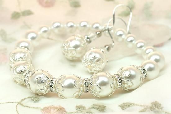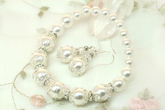 レースのような飾り金具がついた華やかさと清楚さを併せ持つ純白のシェルパールブレスと大粒ピアスのセット。本真珠の養殖に使われているものと同質の"天然貝核"が用いられています。誠実な恋愛、幸せな結婚、家庭運アップ、子宝祈願に。婚活パーティ、合コンなどにもおすすめです。ゆとり含め16cm サイズ直し不可。2点のみのご提供です。