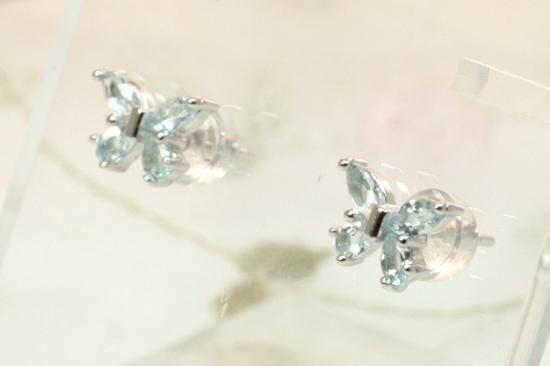 ジュエリータイプのきらきら蝶々のアクアマリンピアス。アクアマリンは好きな人とのコミュケーション能力を高め、相手にうまく気持ちを伝えられるよう促すパワーストーンです。心のすれ違いを調整し、結婚運・財運を高めたい方にも。蝶々は中国では結婚式に使われる縁起のいいモチーフだそう。1点のみのご提供です。