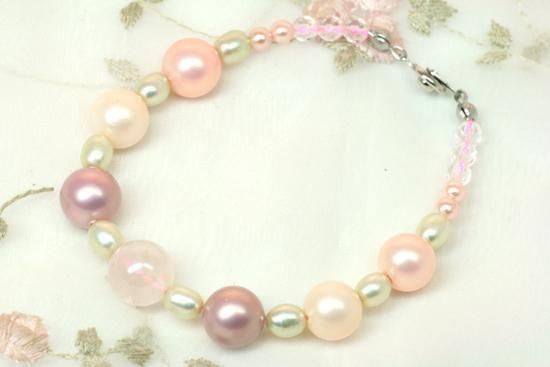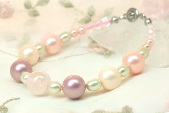 素材:シェルパール10mm玉、ライス形パール ローズオーラ10mm玉 水晶4mm玉多面カット