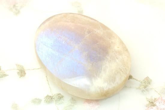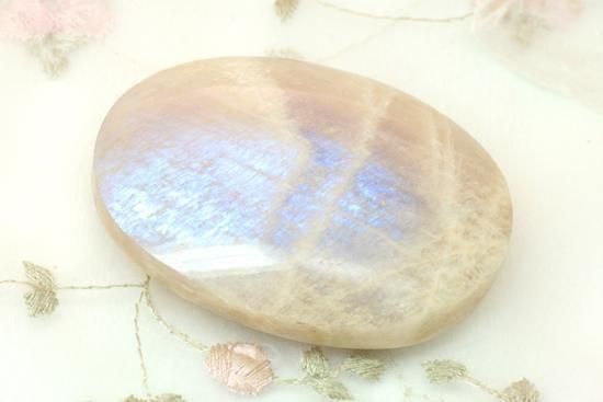 握りがいのある大きさのムーンストーン。両面が青く光ります。ムーンストーンは復縁・恋愛成就・結婚運アップにおすすめのパワーストーンで、持ち主の女性性を高めるとされます。女性特有の病気やPMSにも有効との説もあり、恋の悩みも握って眠ると和らぐはず。持ち歩けるようポーチ付き。1点のみのご提供です。