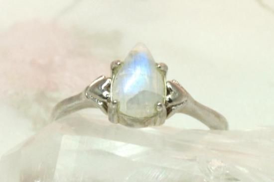 乳白色の中にハッキリとブルーの光が浮かび上がるしずく形ムーンストーンの指輪です。ムーンストーンは復縁、恋愛成就、結婚運アップ、遠距離恋愛などにおすすめのパワーストーン。しずく形は恋の実りを暗示。その両脇には恋愛運全般アップのハートモチーフも。サイズは後ろで調整可能。1点のみのご提供です。