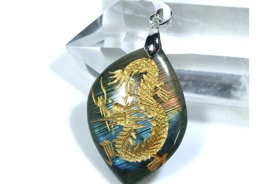 運気上昇の象徴でもあるドラゴンが彫られた、存在感あるラブラドライトの開運ペンダント・トップ。ラブラドライトは恋愛・金運その他オールマイティに運が上がるとされるパワーストーンです。誰が持ってもすぐに効果が出る石とされ、努力が報われるよう導きます。リーフ形は成長を暗示するモチーフ。1点のみのご提供です。