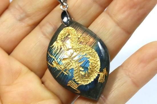 【運気上昇/開運オールマイティ】五爪龍彫りラブラドライト純銀リーフ形ペンダント・トップ