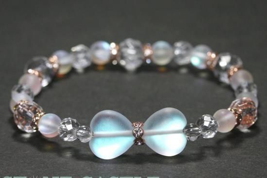 持つ人の魅力を高め、モテ運をアップさせるレインボールミナスとローズクオーツの組み合わせ。ルミナスは、蓄光性の人工石で、ムーンストーンのようなシラーを発します。出会い運を高め、持つ人を幸せへと導きます。ゆとり含め16.5cm(サイズ直し不可)1点のみのご提供です。